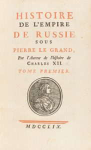 1759-1763. LIBRO. (HISTORIA). [VOLTAIRE:]. HISTOIRE DE L'EMPIRE DE RUSSIE SOUS PIERRE LE GRAND. [París :] S. imp., 1759. 2 vol. en 8º.