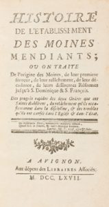 1767. LIBRO. (HISTORIA-RELIGIÓN). HISTOIRE DE L'ETABLISSEMENT DES OINES MENDIANTS. Avignon : Aux déens de Libraires associes, 1767. 8º menor.