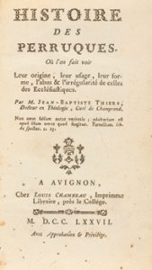 1777. LIBRO. (HISTORIA- CRÍTICA). THIERS, JEAN-BAPTISTE : HISTOIRE DES PERRUQUES. Où l´on fait voir leur origine, leur usage, leur forme, l´abus & l´irregularité de celles des Ecclésiastiques. Avignon : Imp. Louis Chambeau, 1777. 8º menor.