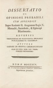 1795. LIBRO. (HUMANIDADES). SEGOVIA, GASPARE DE : DISSERTATIO DE OPINIONE PROBABILI CUYM APPENDICE SUPER RANIMIRI II. ARAGONUM REGIS X. MONACHI, SACERDOTIS, & EPISCOPI MATRIMONIO. Romae : Typ. Pauli Junchi, 1795. 8º mayor.