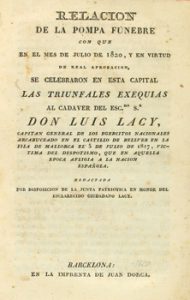 1820. LIBRO. (HISTORIA DE ESPAÑA). RELACIÓN DE LA POMPA FUNEBRE CON QUE EN EL MES DE JULIO DE 1820, Y EN VIRTUD DE REAL APROBACIÓN, SE CELEBRARON EN ESTA CAPITAL LAS TRIUNFALES EXEQUIAS AL CADAVER DEL ESC. S. DON LUIS LACY. Barcelona : Imp. de...