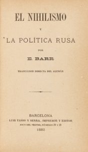 1882. LIBRO. (HISTORIA-RUSIA). BARR, E. : EL NIHILISMO Y LA POLÍTICA RUSA. Barcelona : Imp. Luis Tasso y Serra, 1882. 8º menor.