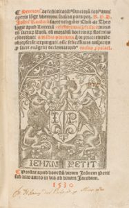 1530. LIBRO. (HUMANITATS). PETIT, IEHAN : SERMONES FESTIVITATIBUS SANCTARUM ANNI OPERIS LONGE.. Lutetia [Paris] : Imp. [Nicolai Preuost], 1530. 8º menor.