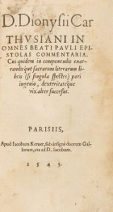 Enc. en media piel, nervios. Interesantes comentarios que el jesuíta Dionisio Cartesiano escribió de las epístolas de Pablo y su discurso sobre la gracia, que se sitúa en el centro de las guerras de religión entre protestantes y católicos durante todo el s.XVI.