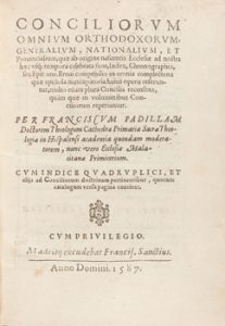 1587. LIBRO. (RELIGIÓN). PADILLAM, FRANCISCUM : CONCILIORUM OMNIUM ORTHODOXORUM, GENERALIUM, NATIONALIUM, ET PROVINCIALIUM, QUE AB ORIGINE NASCENTIS ECCLESIAE AD NOSTRA… PER…. Madrid : Francisco Sanchez, 1587. 4º menor.