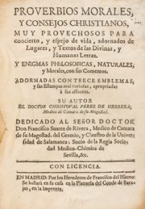 1612. LIBRO. (RELIGIÓN). PEREZ DE HERRERA, CRISTÓBAL : PROVERBIOS MORALES Y CONSEJOS CHRISTIANOS MUY PROVECHOSOS PARA CONCIERTO, Y ESPEJO DE VIDA, ADORNADOS DE LUGARES, TEXTOS DE LAS DIVINAS, Y HUMANAS LETRAS. Y ENIGMAS PHILOSOFICAS, NATURALES, Y...