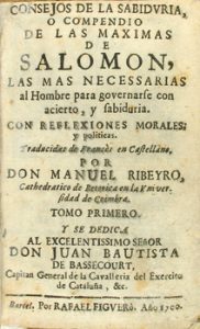 1700. LIBRO : (HUMANIDADES). CONSEJOS DE LA SABIDURÍA, O COMPENDIO DE LAS MAXIMAS DE SALOMON, las mas necesarias al Hombre para governarle con acierto y sabiduria. Con reflexiones morales, y politicas. Traducidas de Ferancès en Castellano, pot...