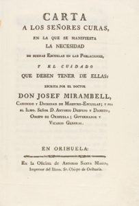 El autor Josef Mirambell era Canónigo y Dignidad de Maestre-Escuela en Orihuela, propone que se construyan escuelas en cada pueblo y que sean regidas por los maestros que las parroquias designen.
