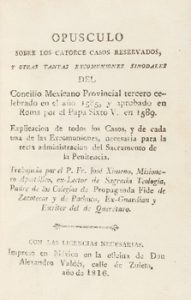 1816. FOLLETO : (MEXICO-HUMANIDADES). XIMENO, FR. JOSÉ : OPUSCULO SOBRE LOS CATORCE CASOS RESERVADOS, Y OTRAS TANTAS EXCOMUNIONES SINODALES DEL CONCILIO MEXICANO PROVINCIAL TERCERO CELEBRADO EN EL AÑO 1585, Y APROBADO EN ROMA POR EL PAPA SIXTO V....