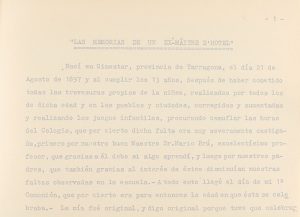 1958. LIBRO : (MEMORIAS). BORRÁS CORTÉS, F. : LAS MEMORIAS DE UN EX-MÂITRE D´HOTEL. 156 fol. mecanografiados solo por el recto, reproducidos al ciclostil y en rústica en 8º mayor apaisado.