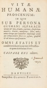 1652. LIBRO : (LITERATURA). [ALEMÁN, MATEO : ]. VITAE HUMANAE PROSCENIUM : IN QUO SUB PERSONA GURMANI ALFARACII. Dantisci [Danzig] : Sumptibus Gerogii Försteri, 1652. 12º.