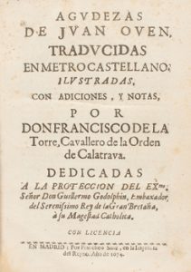 1674. LIBRO : (POESIA). OVEN, JUAN : AGUDEZAS DE JUAN OVEN, TRADUCIDAS EN METRO CASTELLANO. PRIMER VOL. Madrid : Imp. del Reyno por Francisco Sanz, 1674. 8º mayor.