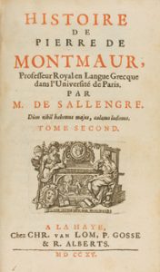 1715. LIBRO : (LITERATURA-SÁTIRA). SALLENGRE, M. DE : HISTOIRE DE PIERRE DE MONTMAUR, PROFESSEUR ROYAL EN LANGUE FRECQUE DANS L´UNIVERSITÉ DE PARIS. La Haye : Chez Chr. van Lom, P. Gosse & R. Alberts, 1715. 2 vol. 8º menor.