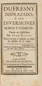 1751. LIBRO : (LITERATURA). LAURE, JUAN : DUFRESNY DISFRAZADO, Ó SUS DIVERSIONES SERIAS Y CÓMICAS. Leon de Francia : Imp. viuda Barret, 1751. 8º menor.