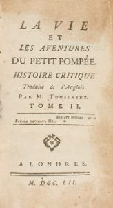 1752. LIBRO : (LITERATURA). LA VIE ET LES AVENTURES DU PETIT POMPÉE. HISTOIRE CRITIQUE. Traducción M. Toussaint. Londres : S. imp., 1752. 2 vol. en 8º menor.