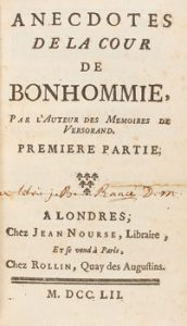 1752. LIBRO : (LITERATURA). [SOLLE, HENRI FRANÇOIS DE LA : ANECDOTES DE LA COUR DE BONHOMMIE. Londres : Imp. Jean Nourse, 1752. 2 vol. 8º menor.