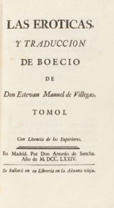 1774. LIBRO : (LITERATURA). VILLEGAS, ESTEVAN MANUEL DE : LAS EROTICAS, Y TRADUCCION DE BOECIO. Madrid : Imp. Antonio de Sancha, 1774. 2 vol. en 8º.