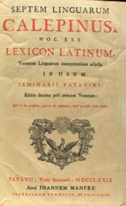 1778-1779. LIBRO : CALEPINO, AMBROGIO : SEPTEM LINGUARUM. CALEPINUS. HOC EST LEXICON LATINUM,… IN USUM SEMINARII PATAVINI. Editio decima post primam Venetam. Patavii : Ed. Joannem Manfre, 1778-1779. 2 vol. en folio mayor.