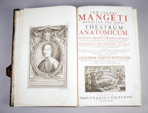MANGET (Jean-Jacques).- Theatrum anatomicum. adjectae sunt B. Eustachii tabulae anatomicae, ab J. M. Lancisio explanatae.Genève, Cramer & Perrachon, 1717. 2 vol. in-folio ; veau de l'époque dos à nerfs orné. Chiffre CBr en queue. T.1- 10 ff., 2...