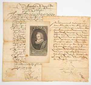 Charles de Blanchefort, Marquis de CRÉQUY, Duc de LESDIGUIÈRES, Maréchal de France en 1621 (vers 1578-1638) – 2 Pièces signées et 1 gravure.