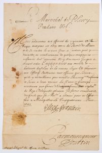 César, Duc de CHOISEUL, Comte DU PLESSIS-PRASLIN, Maréchal de France en 1645 – Pièce signée le Maréchal de « PLESSY PRASLAIN » - Fait à MONTPELLIER (34) le 24 Mars 1647 – « Nous ordonnons aux Officiers de La roque, aussitôt cet ordre...