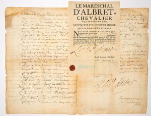 ─ P.S. « Le Maal d’ALBRET » à son entête impr. « Le Maréchal d’ALBRET, Chevalier des ordres du Roy, Gouverneur et Lieutenant Général pour Sa Majesté en GUYENNE. » -