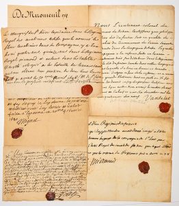 ─ CALAIS (62) 1699 - P.S. VANTELET Lieutenant Colonel du Régiment de ROHAN - Certificat pour un Cavalier blessé - Sceau cire - TB -