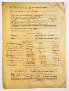 GERS - Rôle des monstre et revue faite à MIRADOUX (Gers) le 6 Janvier 1691 par le Sieur De ROCHEFORT Commissaire des Guerres à la Compagnie de CHASSINCOURT du Régiment de LEGALL composée de 42 Hommes. Parchemin 2pp (30 x 22) en partie impr.