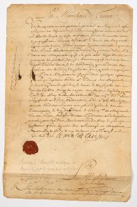 – sceau de cire à ses armes – Le Sieur de MASPARAULT Chevalier Seigneur de Chènevière, et la Dame son épouse à l’encontre du Sieur LE BOULTS Ecuyer, au sujet de plusieurs injures et menaces par eux proférés contre eux -