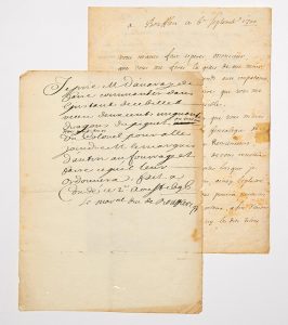 ─ L.S. « Le Maral de BOUFFLERS » fait à BOUFFLERS (80) ce 6 Septembre 1700 – à M. De ROUSSEVILLE – « … J’ai apporté ici les papiers que vous m’avez témoigné désirer pour la Généalogie de MM. De ROUVEREL & De REMIENCOURT… afin d’avoir le loisir de faire copier icy lesdits Titres au cas où vous le jugeriez nécessaire. Je vous supplie de vous souvenir de m’apporter la Généalogie que vous avez nouvellement faite et que vous m’avez promise d’un gentilhomme de PICARDIE pour servir de modèle à celle de Mrs ROUVEREL et DE REMIENCOURT et de m’apporter pareillement tout ce que vous pourrez avoir de nouveau de mon nom depuis que je vous ai vu. Je serai bien aise de savoir si vous avez pris quelques mesures ou éclaircissements pour les plaques de fer dont j’ai besoin, désirant me déterminer au parti que vous croirez le plus convenable pour les faire faire au plus tôt… » - 2pp in-4°.