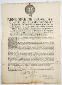 ─ P.S. le Maréchal de TESSÉ (René); Maréchal de France en 1703 - à son en-tête comme “Sire de Froullay, Comte de Tessé, Vicomte de Beaumont, & C. Maréchal de France, Chevalier des ordres du Roy dans les Provinces du Maine et du Perche, Gouverneur d’Ypres, Premier & Grand Ecuyer de Madame la Duchesse de Bourgogne, Commandant en Dauphiné, & Général de l’Armée de Sa Majesté sur les Frontières de Savoie & de Piémont.” - “Étant nécessaire de remettre incessamment sur pied en cette province, le même nombre de soixante Compagnies de Milice qui y était pendant la dernière Guerre de Piémont. Nous ordonnons... que La Communauté de Ratiers & Nantes, élection de Grenoble, fournira six hommes... fait à GRENOBLE ce 25 octobre 1703 - 2 pp (38 x 28) imp. rempli à l’encre - vignette et lettrine –