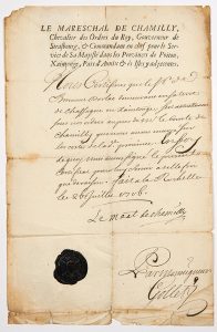 Majesté dans les Provinces de POITOU, SAINTONGE, PAYS D’AUNIS & ès Iles adjacentes. » Certificat au Sieur de BREMONT D’ORLAC demeurant en sa terre de CHASSAGNE en Saintonge, qui sert actuellement sous nos ordres auprès de M. le Comte de CHAMILLY que nous avons envoyé sur les côtes de cette province.
