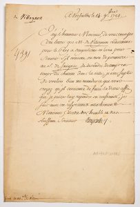 Nicolas Prosper BAUYN D’ANGERVILLIERS (1675-1740) Intendant, Administrateur, Secrétaire d’État à la Guerre. P.S. “D’ANGERVILLIERS” à VERSAILLES (Château de) le 14 Novembre 1731 – au Maréchal de VILLARS – 1p in-folio