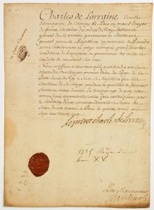 Lettre Signée « Le Prince Charles de LORRAINE » à ses nom et titres, à PARIS le 4 avril 1735 – 1p in-4° (doublé sur papier) –