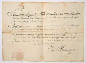 Louis Auguste d’Albert d’Ailly, Duc de CHAULNES, Maréchal de France en 1741 : Pièce signée « Louis Auguste d’Albert D’ALLY » à son entête gravé « Vidame d’AMIENS, Capitaine Lieutenant de la compagnie des 200 Chevaux-légers de la...