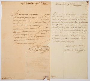 ─ L.S. « Le duc de CHAULNES » à VERSAILLES (78) le 19 Avril 1737 – à M. le chevalier de VILPAIL (l’un des 200 chevau-légers de la Garde ordinaire du Roy) – 1p in-folio – « Monsieur, mon Compagnon… l’intention du Roy est que vous vous rendiez à VERSAILLES bien monté le 12 du mois de Juin, jour de l’assemblée de la Compagnie pour passer en revue devant sa Majesté peu de jours après. La bonté qu’elle a eu de vous donner une année entière de repos doit vous engager à paraître devant Elle sur un cheval d’une figure distinguée… » -