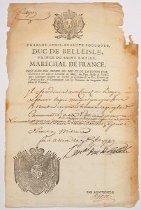 Louis Charles Auguste Fouquet, Duc de BELLE-ISLE, Maréchal de France en 1741 – Pièce signée « Le Mal Duc de BELLEISLE » Fait à NICE ce 7 Sept 1749 - à son entête -