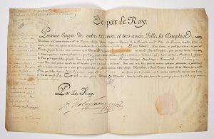 Brevet de retenue D'ARGENTIER DE MADAME LA DAUPHINE, Fille du Roy, pour Louis René PINSON, donné à Versailles le 14 Janvier 1747. Pièce signée du Roy LOUIS XV (Secrétaire) contresignée PHELYPEAUX, et cosignée en marge de Louis-Alexandre de...