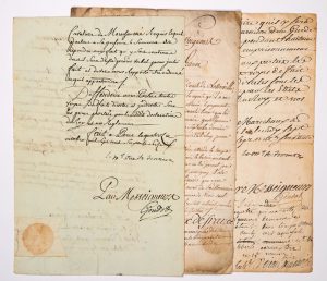 Requête manus. du sieur RAULY DE BONNEFON Ecuyer GENDARME de la Garde Ordinaire du Roy, contre le Sieur DE JEAN DE NAUVILLE Officier de la Légion de CORSE, afin d’être payé suivant son billet d’Honneur signée d’ORGEVAUX, suivie de l’Ordonnance des MARÉCHAUX DE France. « faute de ce faire, qu’il y sera contraint par garnison d’un garde près sa personne et ensuite par emprisonnement… » - Manus. 4pp in-folio - Sceau sous papier –