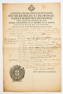 Louis François Armand de Vignerot du Plessis, Duc de RICHELIEU, Maréchal de France en 1748 - Pièce signée « Le M. Duc de RICHELIEU » à son entête gravée « Louis François Armand DUPLESSIS Duc de RICHELIEU et de FRONSAC, pair et Maréchal...