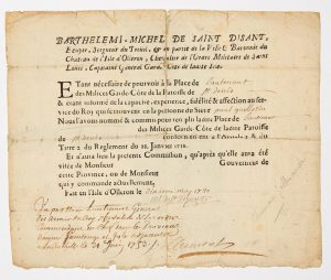 (CHARENTE MARITIME. ILE D’OLÉRON. 1750) - Nomination de Lieutenant des Milices Garde Côtes . Pièce signée “Barthélémi-Michel DE SAINT DISANT, Écuyer, Seigneur de TREÜIL et en partie de la Ville & Baronnie du Château de l’Îsle...