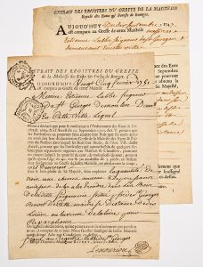 •1°) “Extrait des Registres du Greffe de la Maîtrise des EAUX & FORÊTS de BOURGES. Déclaration du 25 Février 1751, de Messire Étienne LABBE Seigneur de ST GOEORGES DE MOULON (St Georges sur Moulon 18) Demeurant dans cette Ville. Il désire faire exploiter la quantité de 300 Chênes anciens et dépérissant au dessus de 40, a les prendre dans les Bois de ladite Seigneurie situé paroisse ST GEORGES ressort de la Maîtrise distance de 10 lieus de la Loire...” - Formulaire impr. rempli à l’encre -