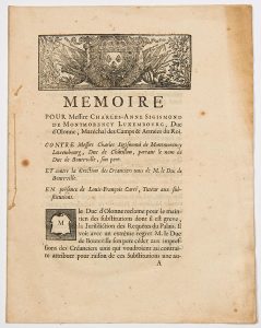 « Mémoire pour messire Charles-Anne Sigismond de Montmorency Luxembourg, Duc d'Olonne, Maréchal des camps & Armées du Roi. Contre Messire Charles Sigismond de Montmorency Luxembourg, Duc de Châtillon, portant le nom de Duc de Bouteville, son père. Et contre la direction des créanciers unis de M. le Duc de BOUTEVILLE… » -
