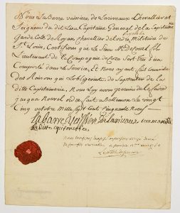 et Seigneur dudit lieu Capitaine Général de la Capitainerie Garde Côte de ROYAN, Chev. de l’O. R. M. de St Louis - Certificat pour “le sieur DECOURT fils Lieutenant de la Compagnie de COZE s’est très bien comporté dans le service..” permission de s’absenter de la Capitainerie -