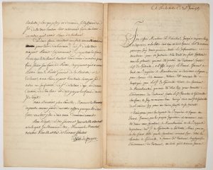 ─ L.S. “le Maal de SENECTÈRE” avec 2 lignes Autogr. , à LA ROCHELLE (17) ce 30 juin 1767 – à un Maréchal – Lettre en réponse à celle du tribunal du 3 juin 1767 ; au sujet des insultes faites à la Maréchaussée de COGNAC par le Sieur de GADEVILLE qui ont été chez lui, pour exécuter l’ordonnance du Tribunal contre le Sieur Chevalier de GADEVILLE, son frère. –
