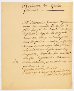 « RÉGIMENT DES GARDES FRANÇAISES. Le sieur BRETONNIER exerçant depuis 32 ans la charge de Prévôt Général des Bandes et du Régiment supplie Sa Majesté comme cette Charge ne tombe point dans les parties casuelles, et que ses services peuvent encore être utiles en les continuant le plus qu’il lui sera possible, de vouloir bien accorder à son fils la permission de la vendre si lors de sa mort, il en était en possession. » - Le Maréchal duc de BIRON écrit « Je certifie que le BON est de la main du Roy. » - 1p in-4° -