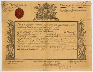 Louis Antoine de Gontaut, Duc de BIRON, Maréchal de France en 1757 – P.S. du “Mal Duc de BIRON” Colonel au RÉGIMENT DES GARDES FRANÇOISES - Infanterie - Congé militaire Absolu pour Pierre BROCARD dit Brocard Soldat de la Compagnie de...