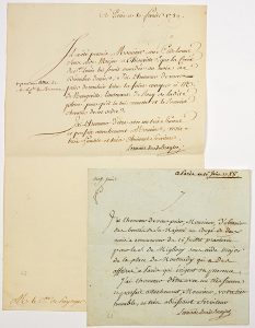 ─ L.S. « Le Maal Duc de BROGLIE », à Paris ce 10 Février 1789, à M. le Comte de PUYSÉGUR – « Il a été promis, Monsieur, au Sieur De LORME Sous Aide Major à THIONVILLE, par une lettre de M. le comte de BRIENNE, que la CROIX de SAINT LOUIS lui serait accordée au mois de Décembre dernier ; J’ai l’honneur de vous prier de vouloir bien la faire envoyer à M. De MANGEVILLE, Lieutenant du Roy de ladite Place, pour qu’il la lui remette et le reçoive Chevalier de l’Ordre… » - 1p in-folio.