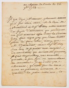 “Il y a déjà, Monsieur, plusieurs années qu’il s’est élevé entre M. le Curé de MONTREUIL et le Sieur PILLON Votre Receveur des sujets d’altercation qui produisent un fort mauvais effet dans la Paroisse. J’ai fait ce que j’ai pu pour les faire cesser, ainsi que l’Intendant, mais le Sieur PILLON... fait une nouvelle querelle à son Curé en renouvelant les anciennes. Je ne doute pas, Monsieur, qu’étant sur les lieux, vous ne parveniez aisément à remettre la paix entre eux, et faire cesser une division qui n’a que trop duré...” - 2pp in-4° -