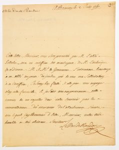 « Cette lettre, Monsieur, vous sera présentée par M. l’Abbé PELLECHET, avec un certificat très avantageux de M. l’archevêque de ce Diocèse. Mr le Marquis de GRAMONT (sic Grammont) s’intéressant beaucoup à cet Abbé me presse de joindre près de vous ma sollicitation à ce certificat. Je serai très flatté si elle peut vous engager à lui être favorable… » -